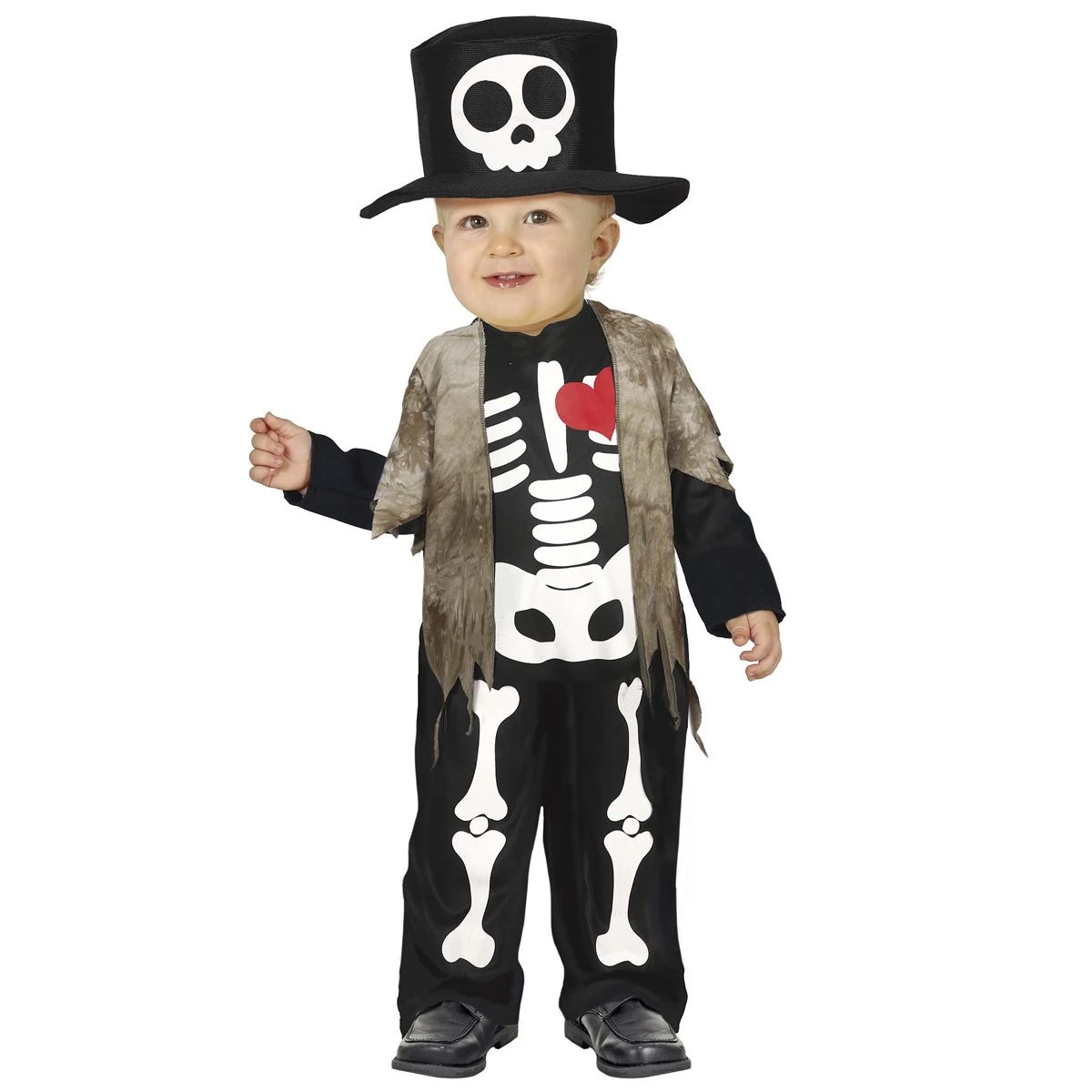 Zeer mooi skelet kostuum voor baby’s. Het pak bestaat uit een jumpsuit bedrukt met een skelet, een hoge hoed met een doodshoofd er op en een vies lijkende jas. Super geschikt voor halloween of carnaval!
