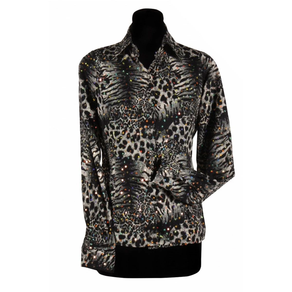 Glanzende damesblouse met panter/tijger print in grijs/zilver met gouden pailletten. Een supergave blouse voor jouw foute party of voor onder je carnavalsjas.