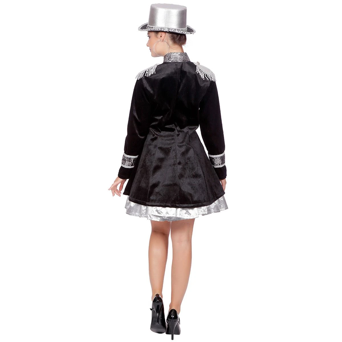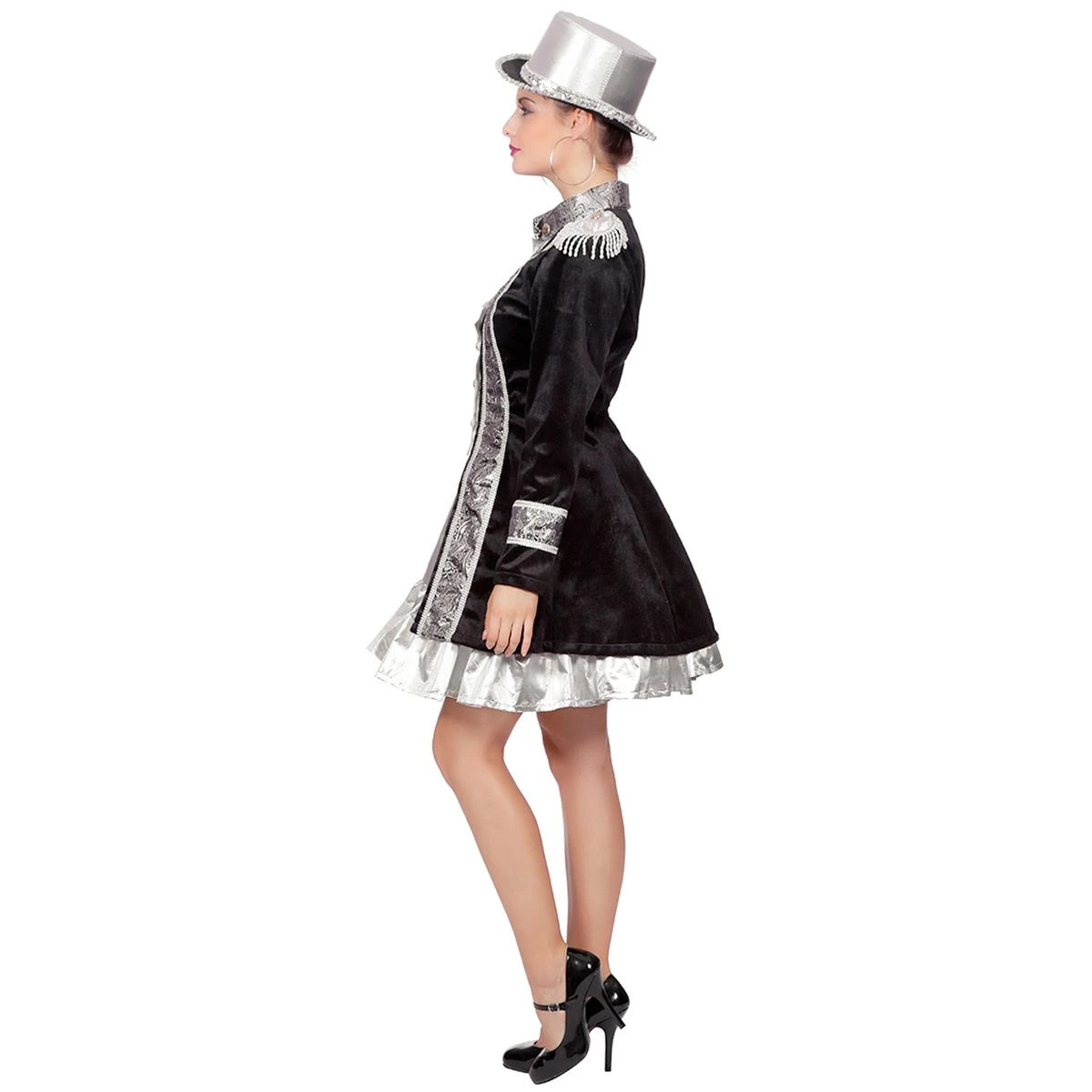 Prachtige, getailleerde zwart/zilveren fluwelen damesjas met aan de voorzijde een zilver gilet pand. De jas is afgewerkt met zilver brokaat band op de voorzijde en de mouwen. Inclusief zilveren epauletten. Een bijpassende herenversie is ook verkrijgbaar.