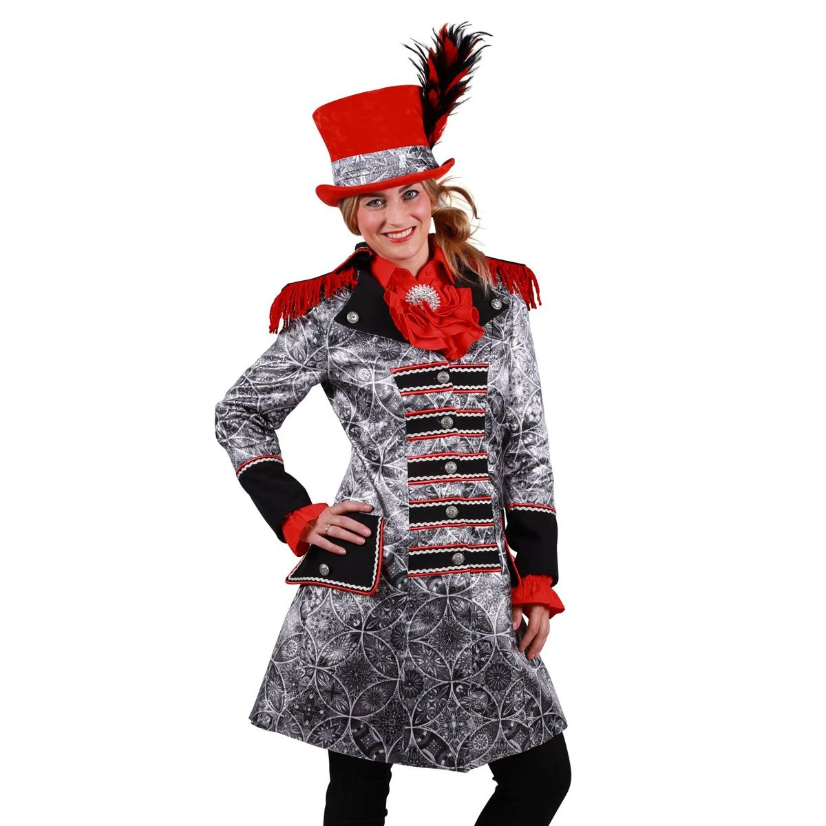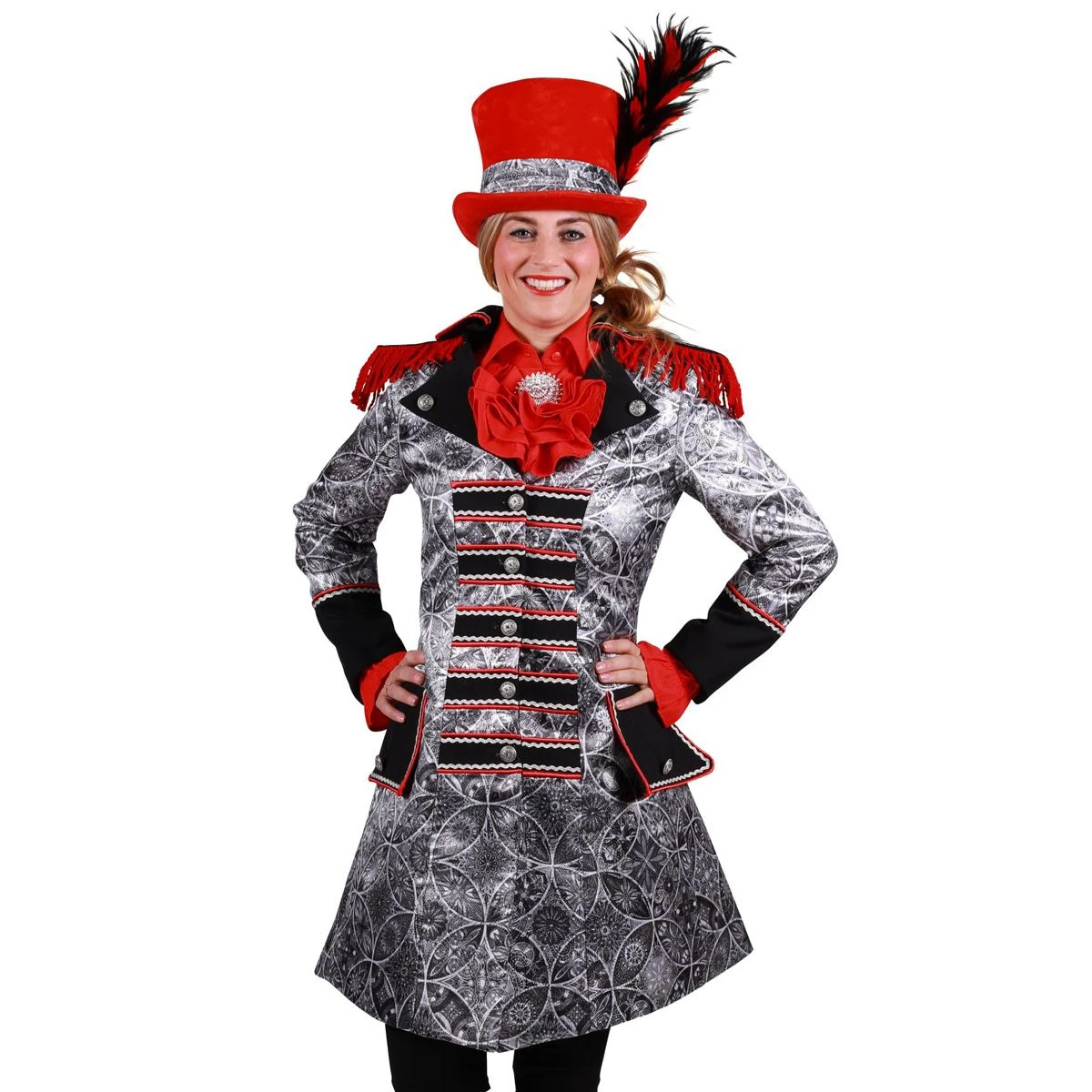 Schitterende brokaat jas van 100% polyester. Deze gevoerde jas heeft een chique brokaat print en een mooie zilvere glinstering in de stof. De jas is afgewerkt met rode accenten en epauletten. Leuk te combineren met een petticoat of glitterbroek. Een jas om mee voor de dag te komen! Van deze jas is ook een herenmodel beschikbaar.