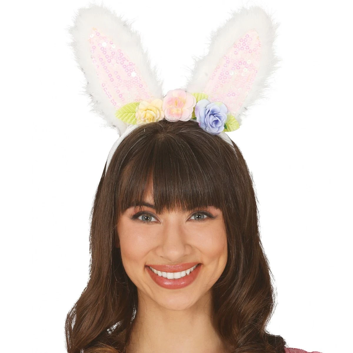 Diadeem met witte konijnenoren met een roze binnenkant van pailletten. Op de voorkant van de oren zitten bloemen verwerkt.