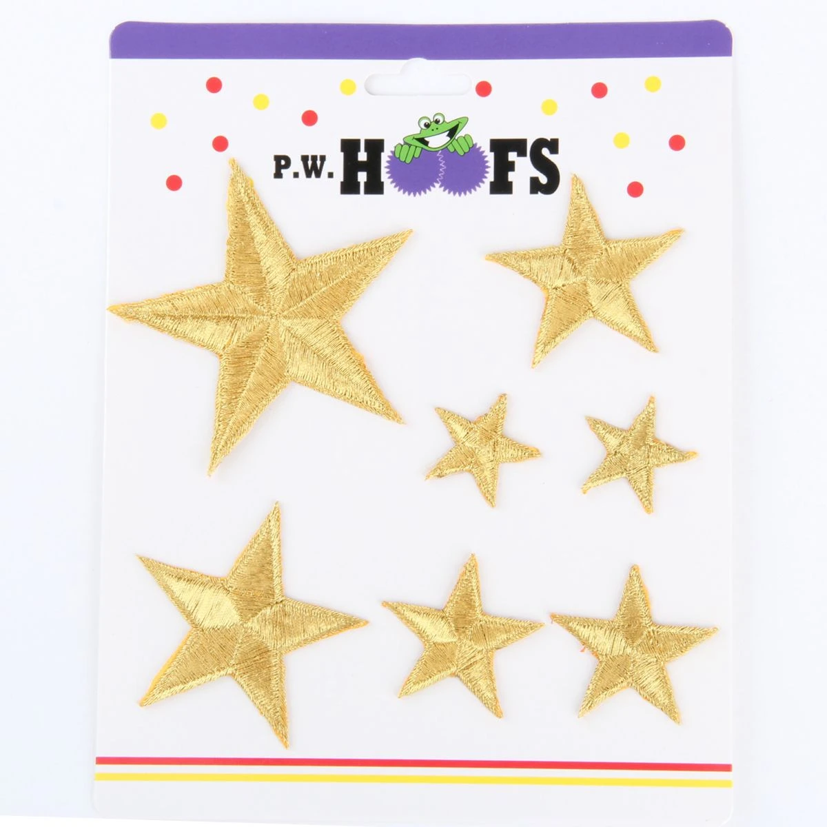 Set van 7 geborduurde gouden sterren. Met deze strijkbare sterren kun je je kleding verfraaien. De sterren hebben afmetingen van 8 cm, 6 cm, 4 cm en 2,5 cm.Â