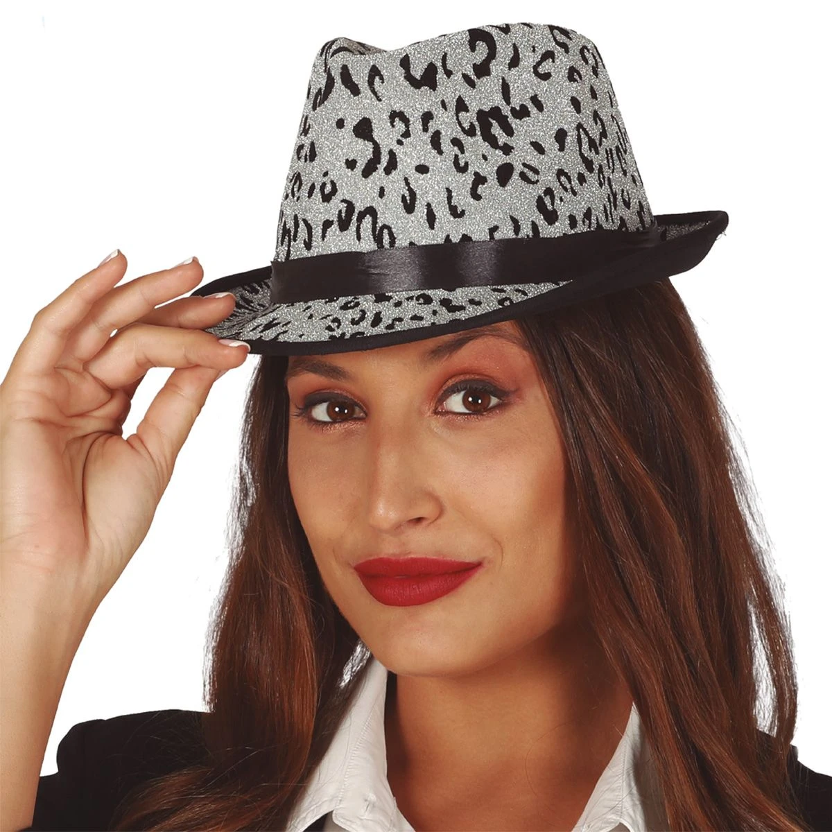 Zilveren gangster glitter gleufhoed met luipaard print.