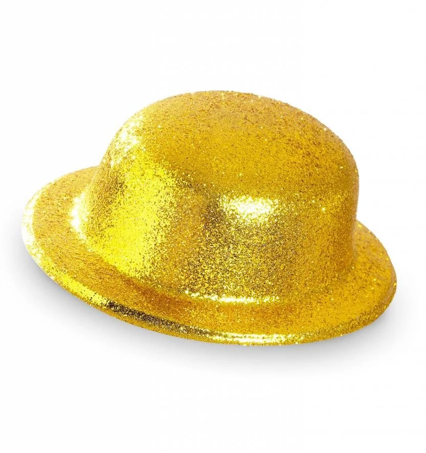 Deze bolhoed is goud van kleur en is voorzien van glitters.