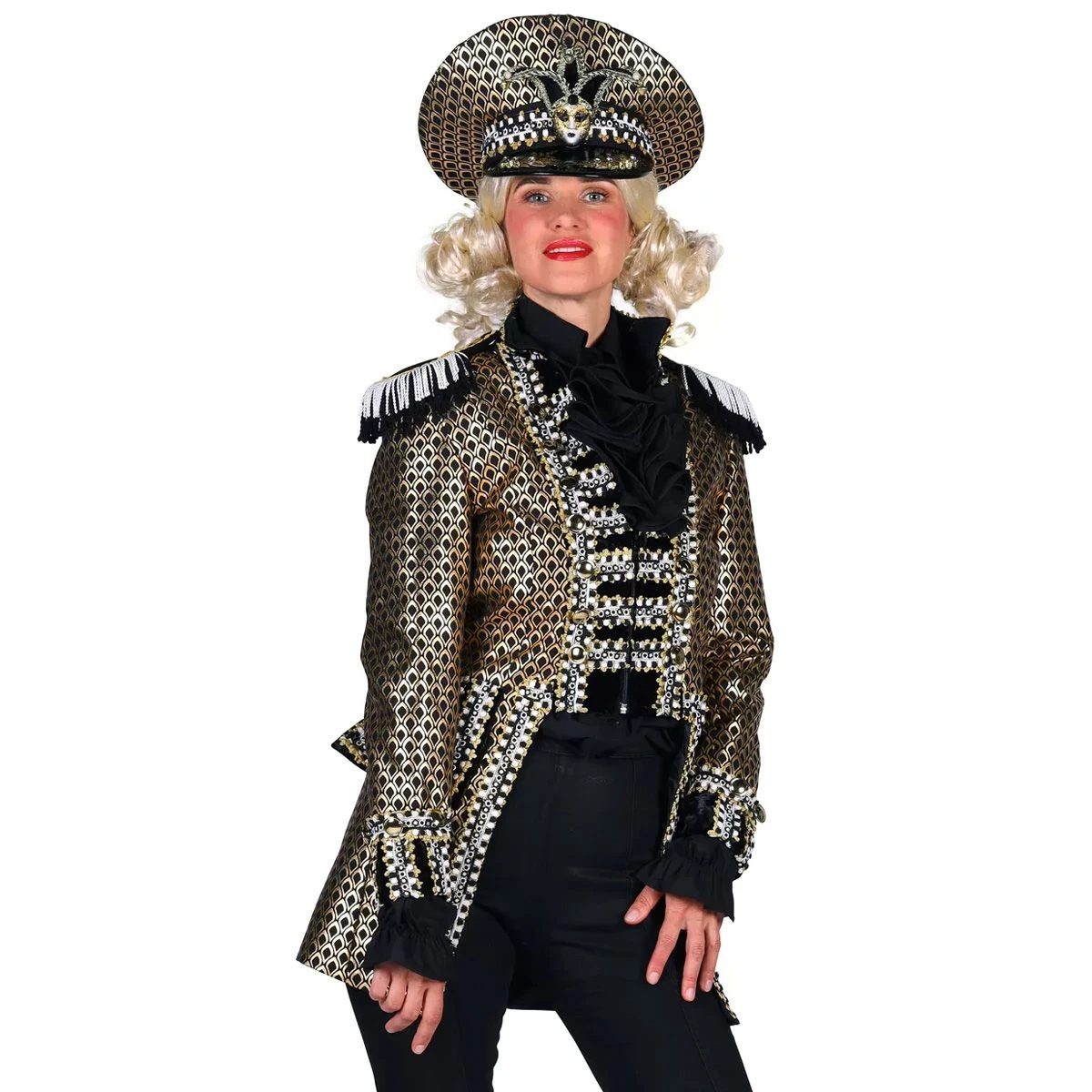 Deze herenjas met een prachtig goud/zwart patroon is een stijlvolle jas voor carnaval. De jas is luxe afgewerkt met brokaatband, epauletten en schitterende knopen. Combineer deze jas met een mooie blouse, broek, rok, pet en je staat er op en top feestelijk chique op!
