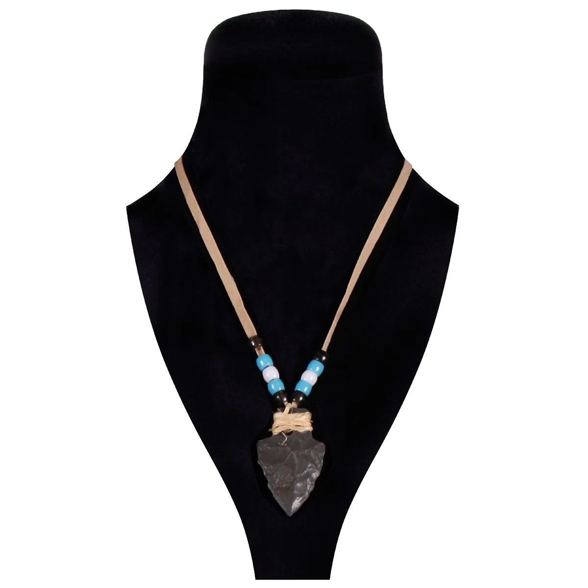 Bruin suede ketting met pijlpunt hanger. De indianenketting is verder versierd met blauwe en witte kraaltjes.