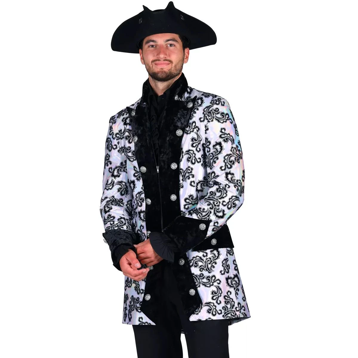 Zeer luxe markies jas. De jas is wit met een chique zwart patroon, de revers zijn van zwart fluweel. Maak de look af met een van onze driesteken en beenkappen!