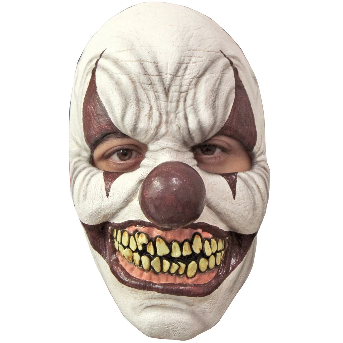 Scary clown masker van latex voor Halloween met vergeelde tanden. Dit masker is perfect in combinatie met een clown kostuum. Je hoeft niet te schminken en bent snel klaar! Laat de clown maar lachen, hahaha!