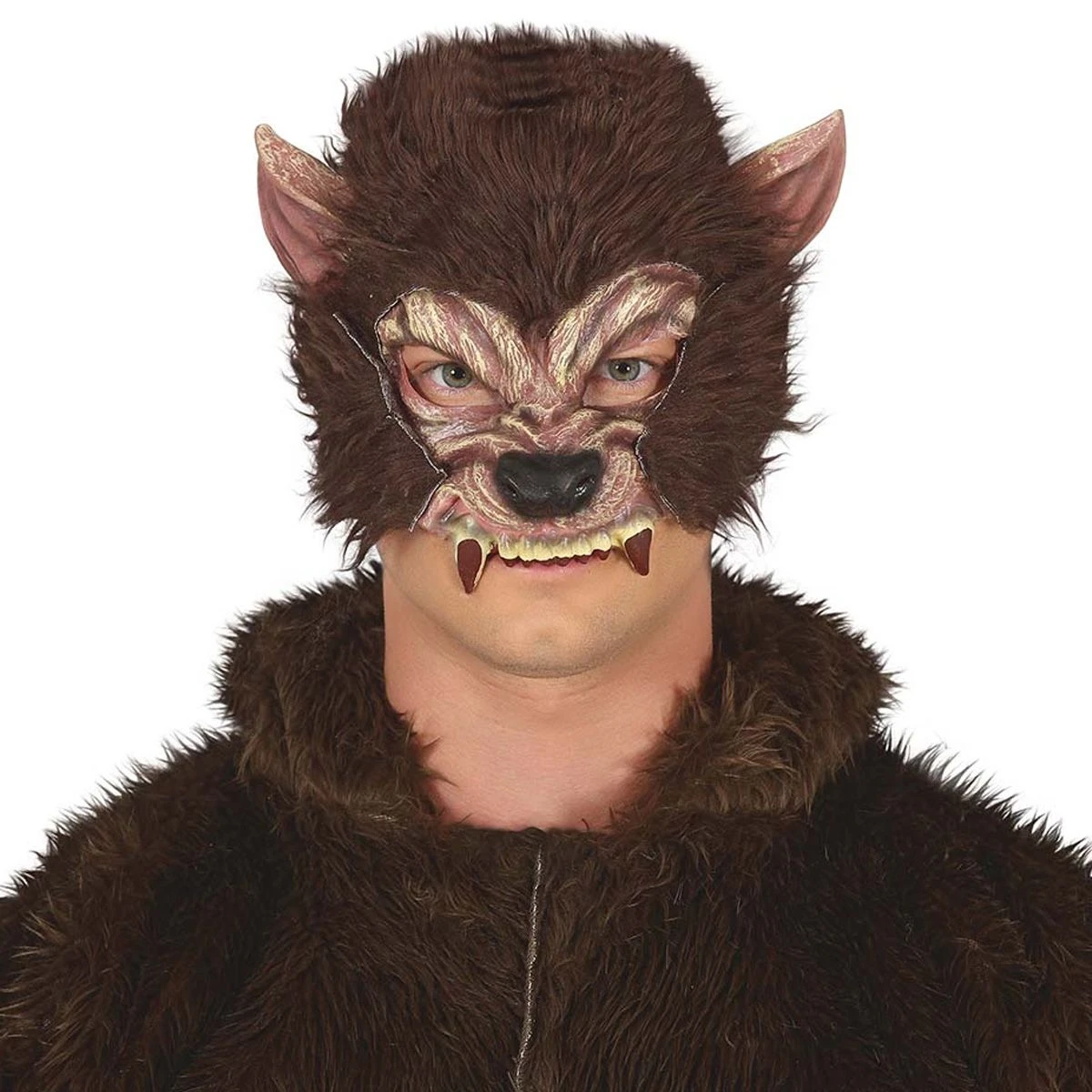 Half wolvenmasker met haar. Dit masker met oren en tanden is perfect voor jouw enge weerwolf look! Laat volle maan maar komen!
