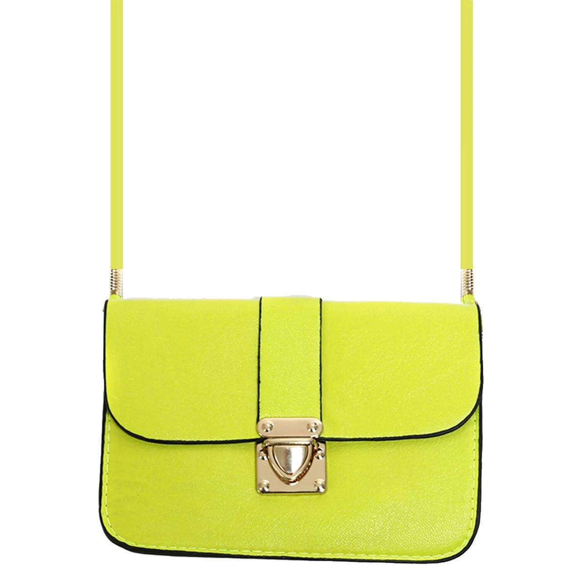 Neon geel tasje met schouderkoord. Het tasje sluit door middel van een goudkleurige gesp. Aan de binnenzijde bevinden zich twee vakken.