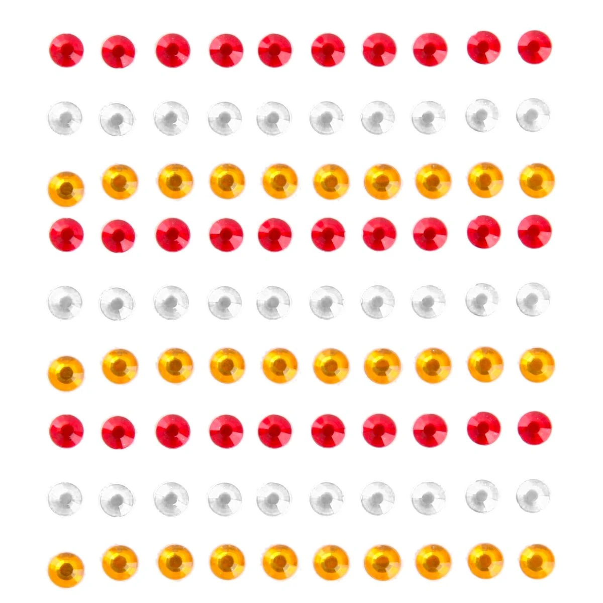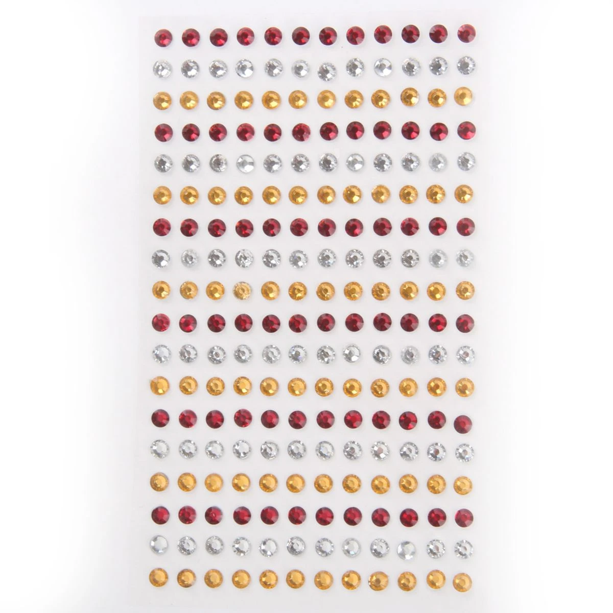 Versier je gezicht met deze rood-wit-gele strass steentjes. De steentjes zitten op een kaartje van 216 stuks en zijn gemakkelijk op je huid te plakken en te verwijderen.