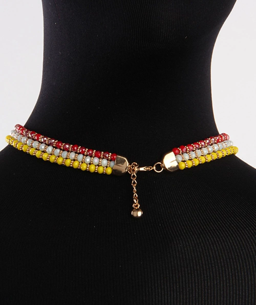 Oeteldonk sieraad met kralen en kettinkjes in rood-wit-gele kleur. De ketting heeft een goudkleurige sluiting. Dit sieraad is ook erg leuk te dragen als armband door hem twee keer om te slaan!