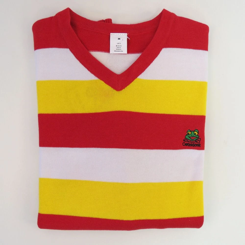 Fijn gebreide trui van 100% katoen, mooie kwaliteit, met Oeteldonk embleem geborduurd. Aansluitende hals met v-hals, boord aan onderzijde en mouwen.