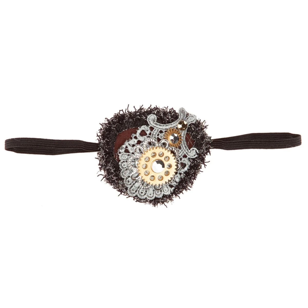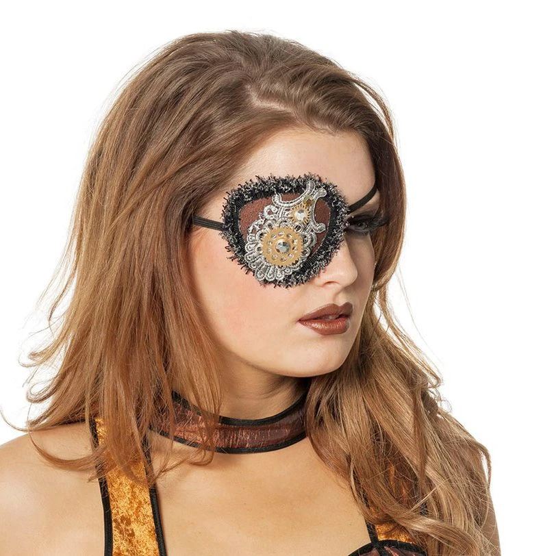 Het ooglapje is bruin van kleur en is versierd met o.a. een strass steen en een radertje.