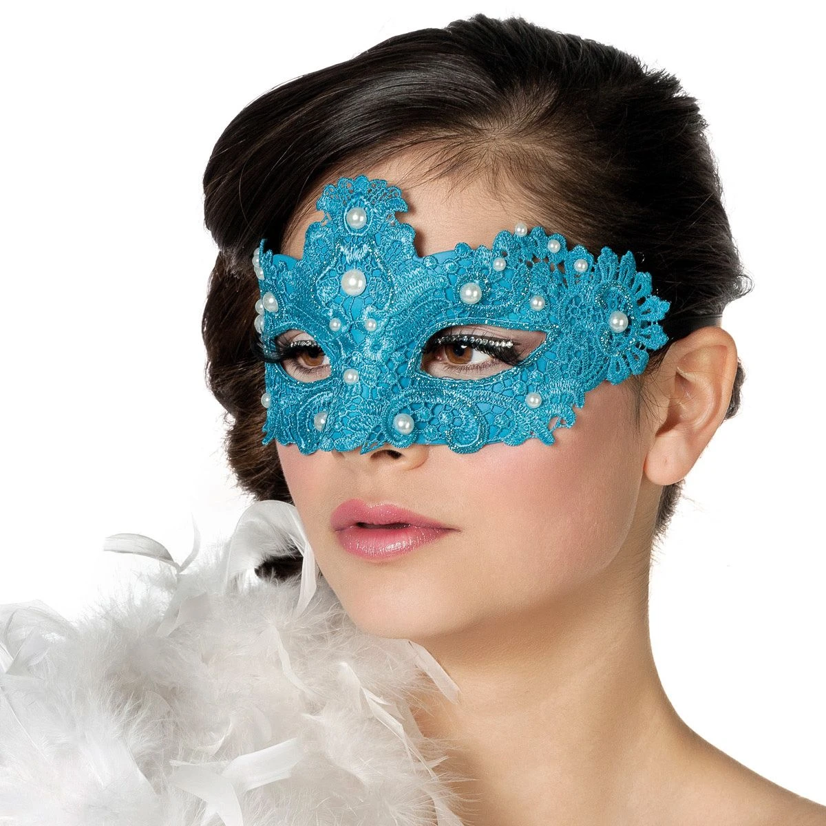 Super mooi stoffen masker. Dit aqua blauwe masker is afgewerkt met kant, parels en glitters. Super geschikt voor blauwe outfits. Combineer ‘m met een van onze vele blauwe accessoires!