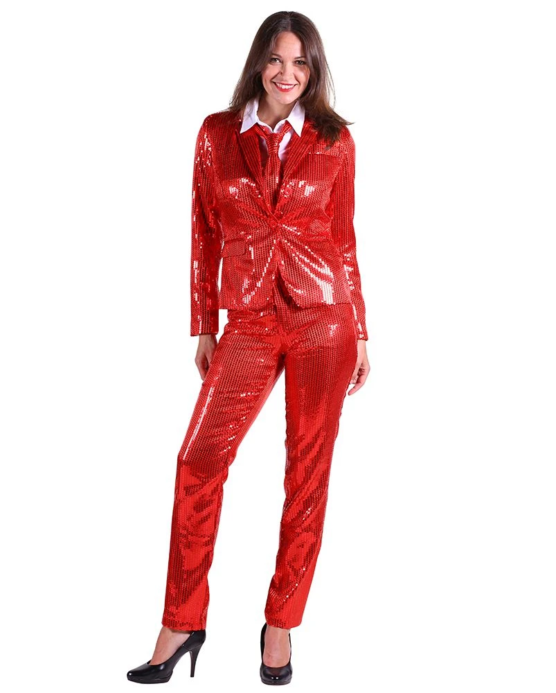 Dit feestelijke kostuum bestaat uit een paillettenbroek en een paillettencolbert.