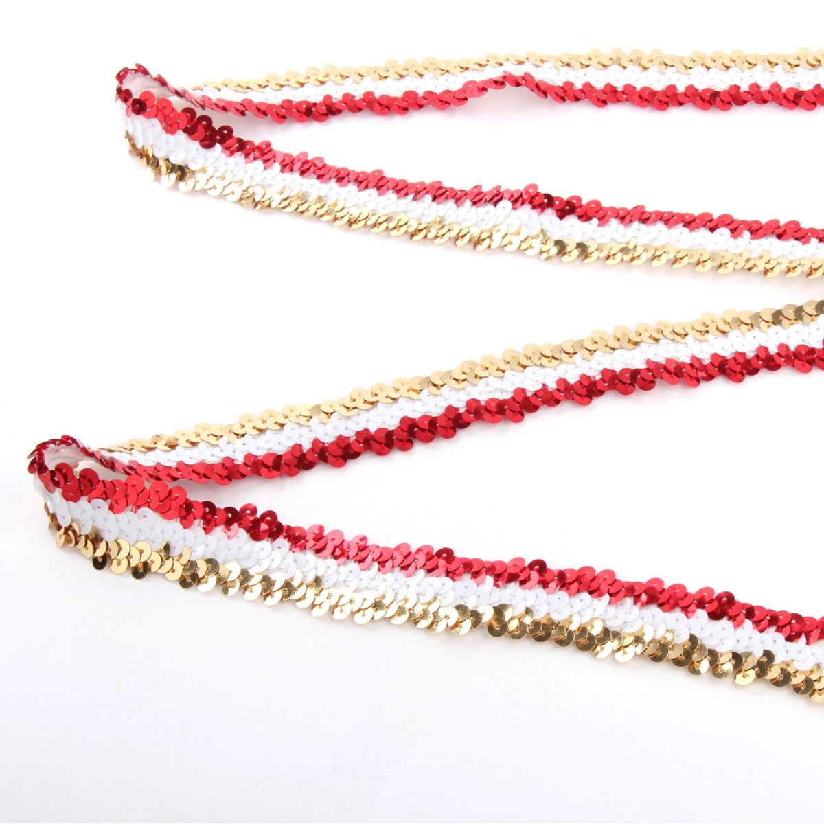 Hele mooie rood-wit-gouden Oeteldonks paillettenband, elastisch. Het band is 2 cm breed. Voor het maken van een hoofdbandje of versieren van je kiel, jasje, hoedje, tas of ter decoratie.Â