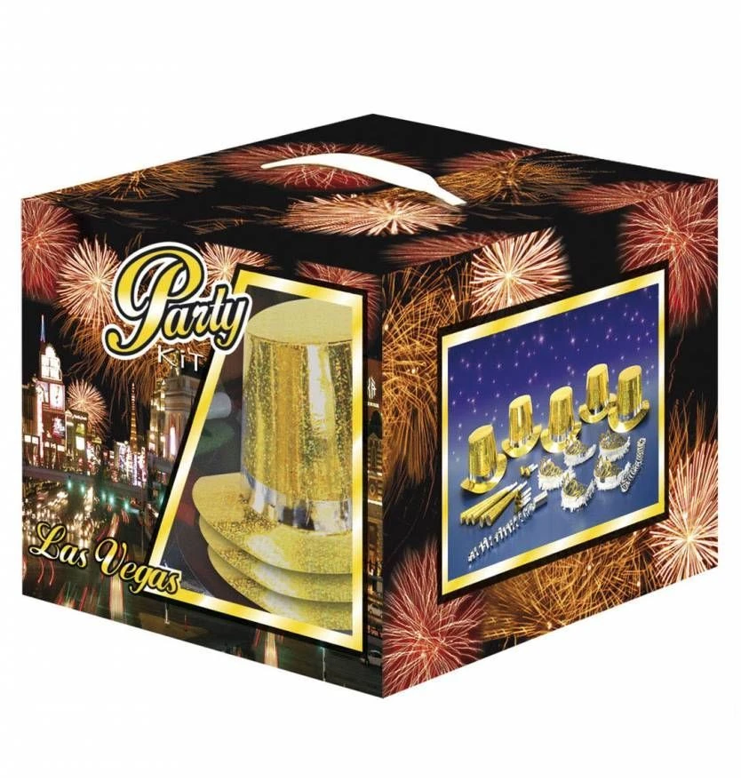 Deze goudkleurige Party kit “Gold las Vegas” bestaat uit 5 glitterhoeden, rolfluitjes, serpetines, diademen en toeters.