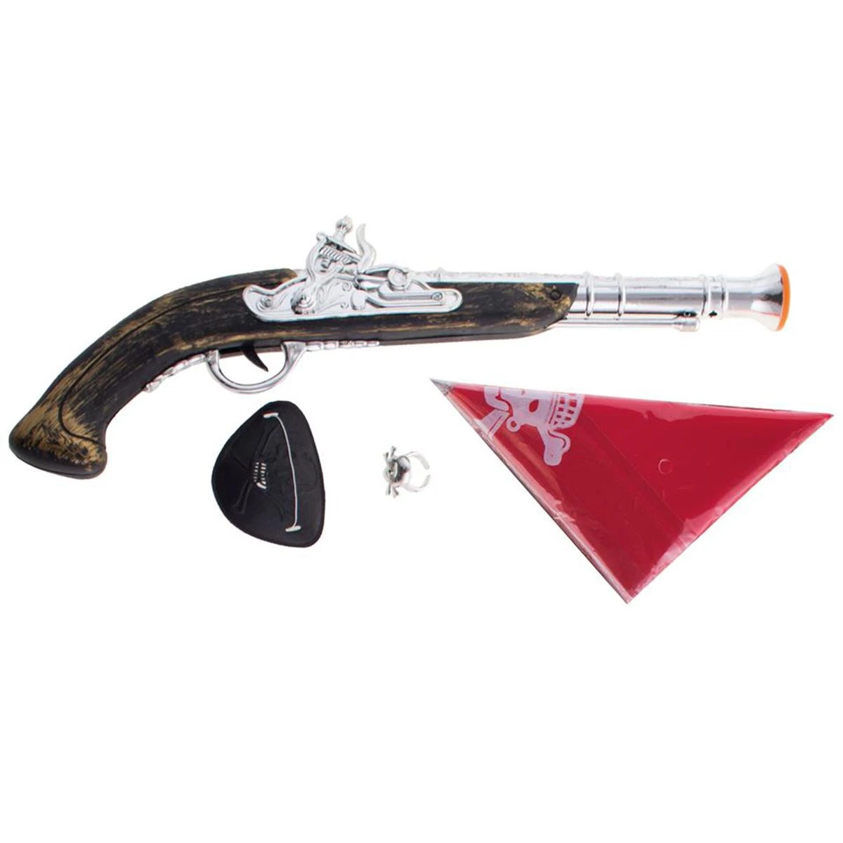 Tweedelige set met accessoires voor de piraten onder ons! Een stoer ooglapje, bandana, ring en een neppistool die jouw piratenoutfit compleet maken.