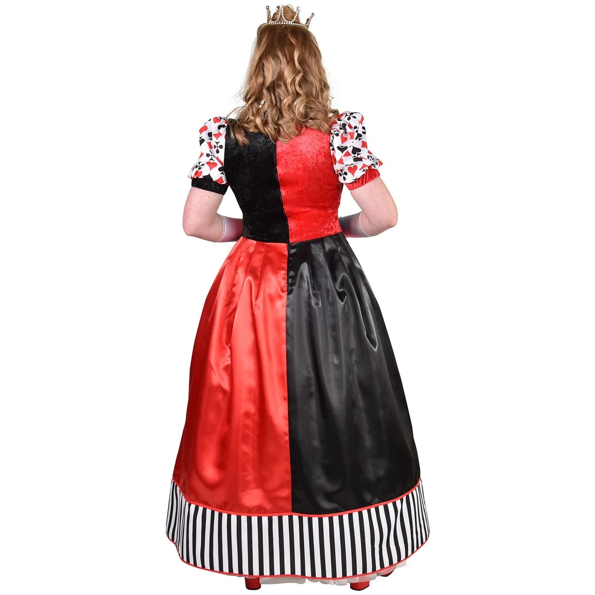 Zeer mooie queen of cards jurk. De jurk is voornamelijk rood/zwart maar is in het midden en op de mouwen versierd met een prachtig kaartkleur patroon. Maak de look af met een kroontje en lange handschoenen om er echt koninklijk uit te zien!
