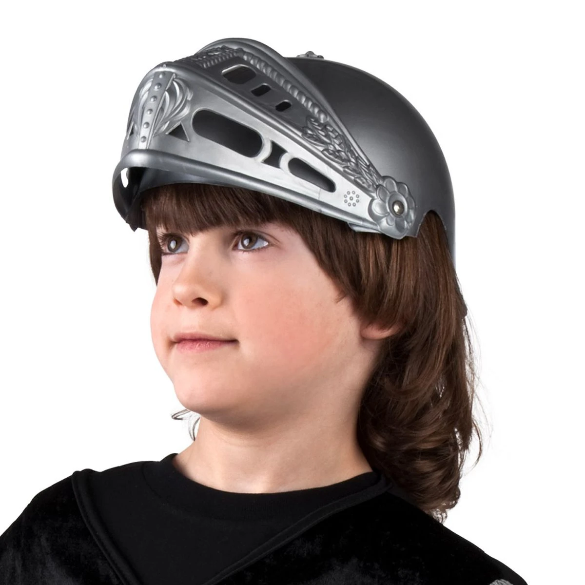 Stoere ridderhelm in zilvergijs met een vizier wat open en dicht kan. Met deze helm is jouw ridderoutfit helemaal compleet! One size.