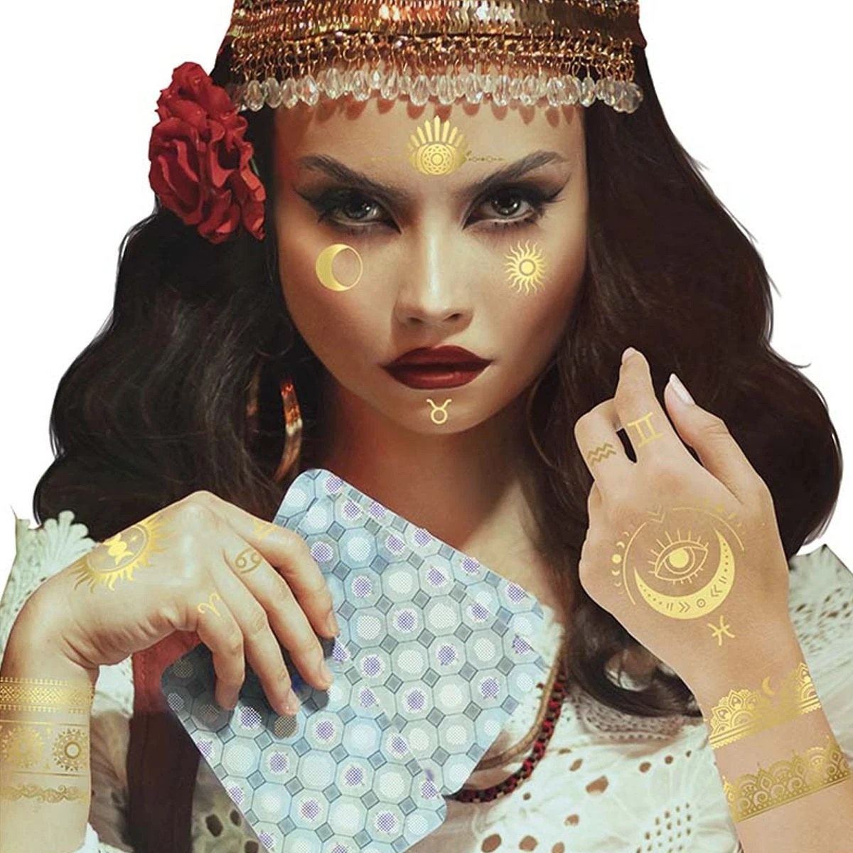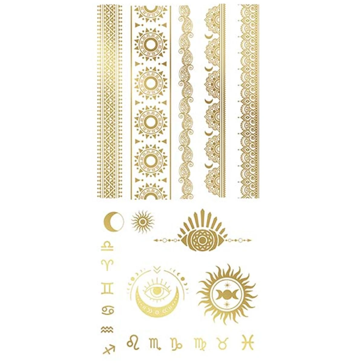 Set van glimmende gouden tattoo’s. Heb jij binnenkort een thema feest? Met deze tattoo’s maak jij jou outfit extra speciaal! Ook zeer geschikt voor kinderen.