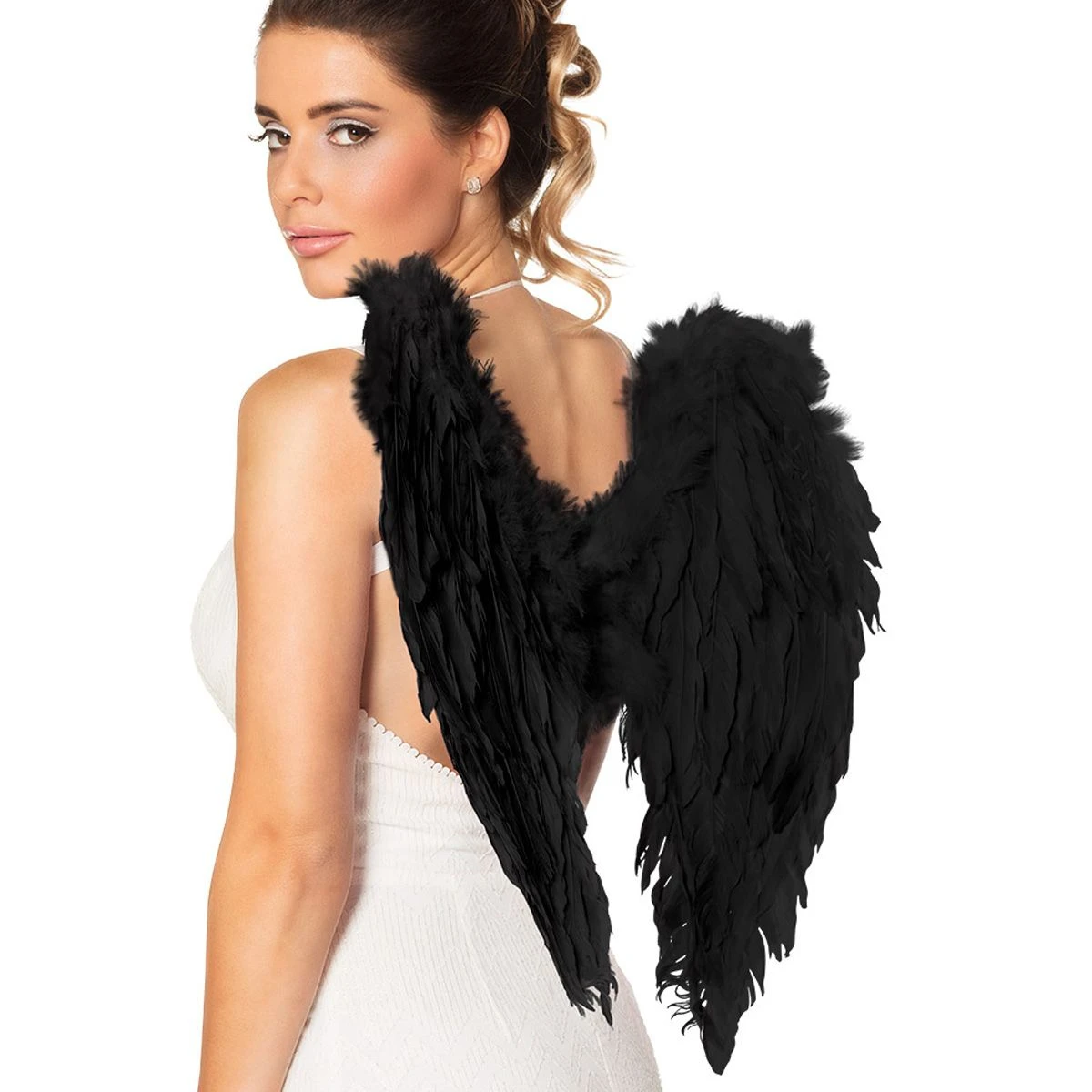 Deze schitterende zwarte vleugels zijn zeer vol bezet met zwarte veren. Aan de bovenzijde zit een rand marabou veertjes voor een extra mooi effect. De lengte van de vleugels is 45 cm en de spanwijdte is 55 cm. Je bevestigt ze gemakkelijk om je schouders met de elastieken banden. De vleugels zijn buigbaar, dus in elke gewenste stand te buigen. Ze maken je duivel of halloween outfit helemaal af!