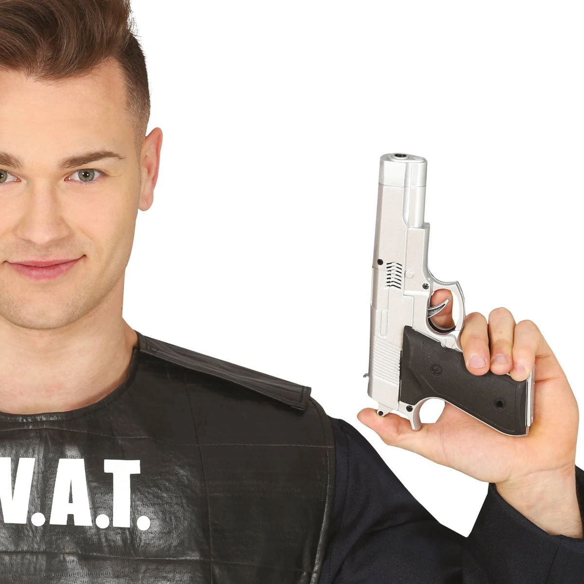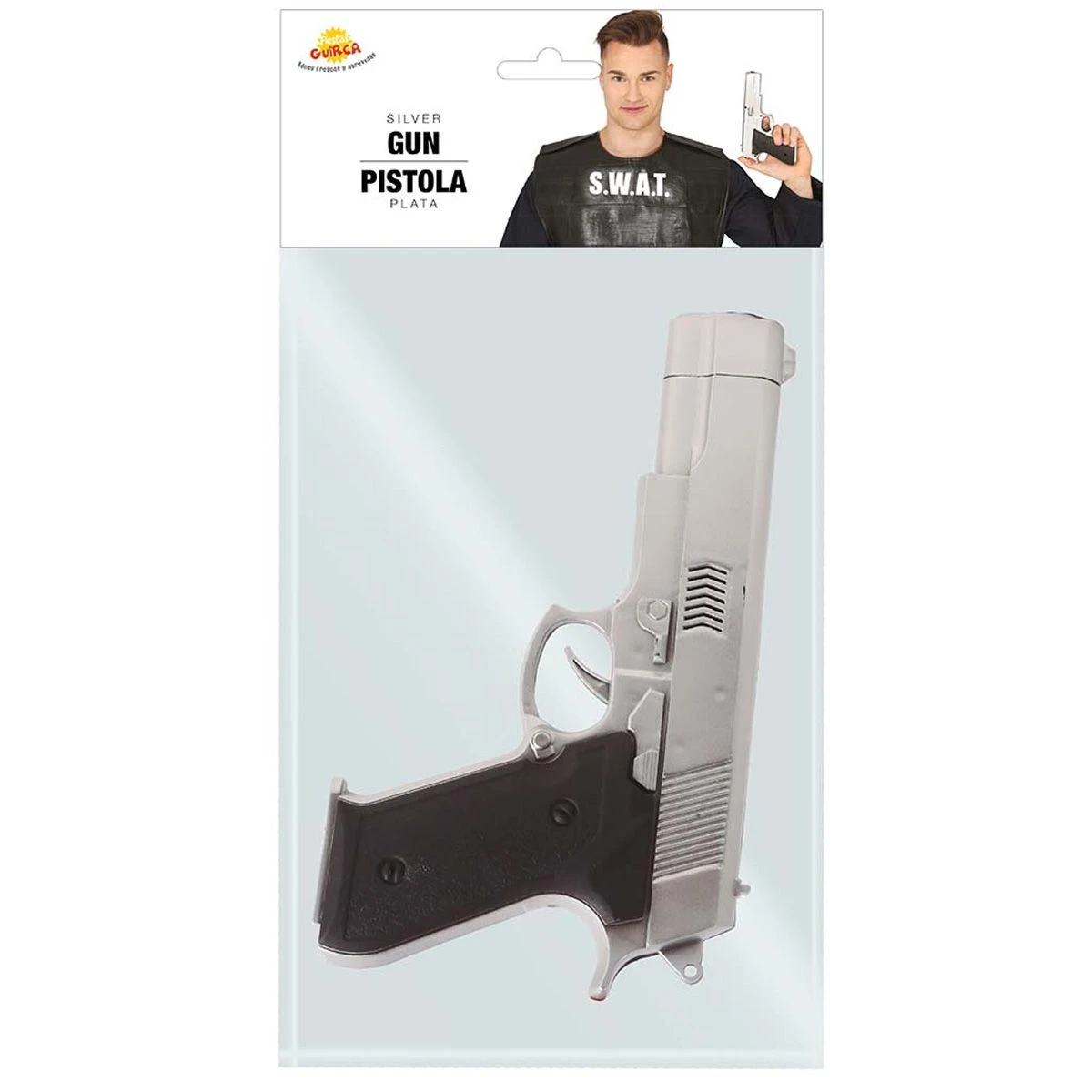 Stoer zilver pistool met een zwart handvat. Dit pistool is een geweldig accessoire voor bij heel veel outfits. Combineer ‘m bijvoorbeeld met een leger, politie of gangster kostuum!