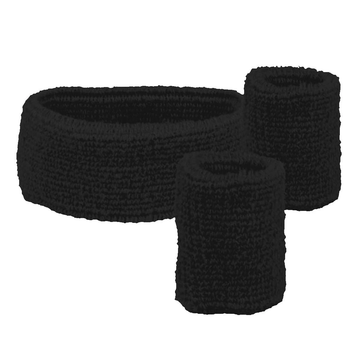 Zwarte zweetbandjes. In een set zitten twee polsbandjes en een hoofd zweetbandje.
